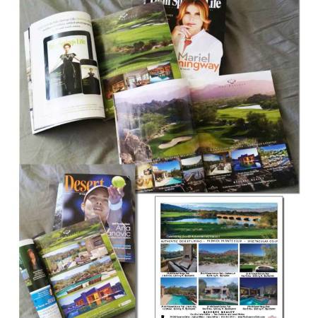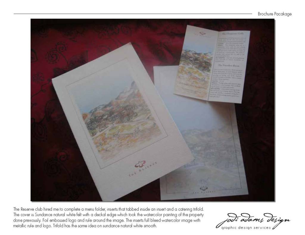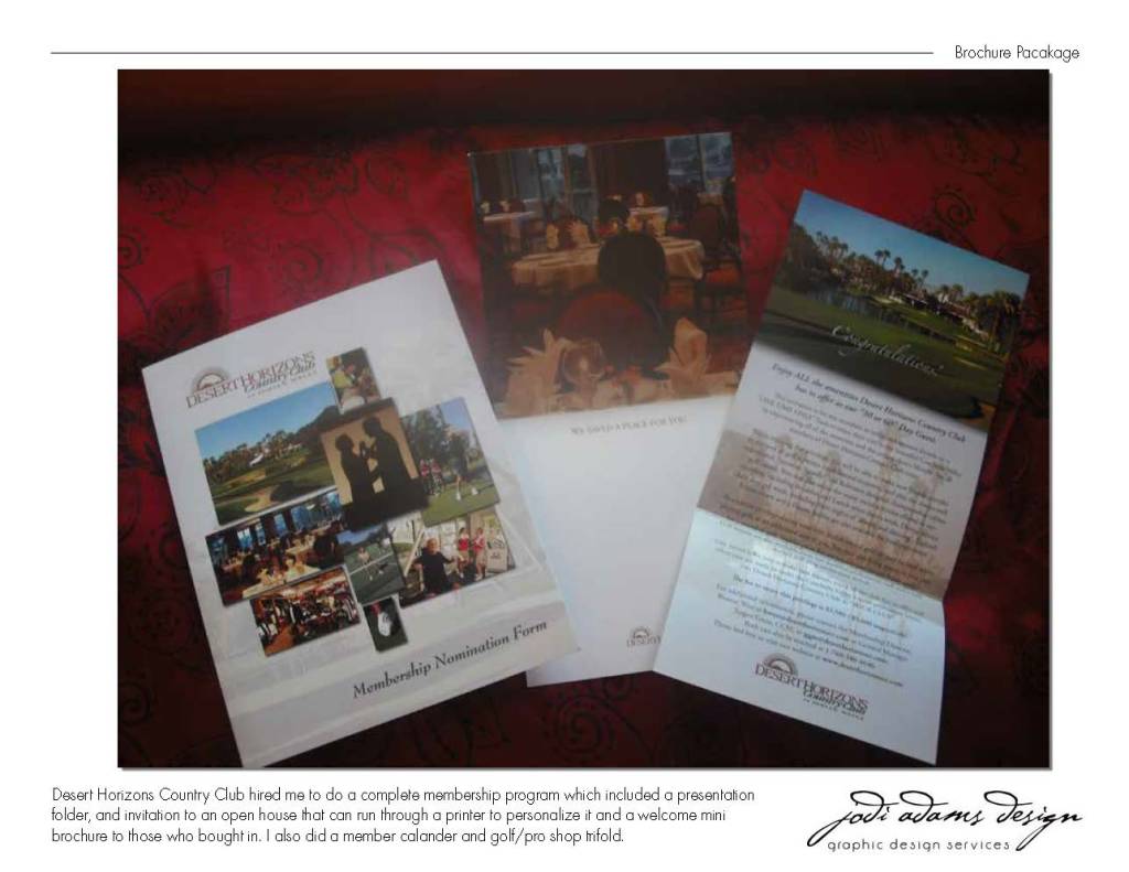 Membership Roster and community brochure with a presentation folder. All coordinating. This is a membership package for golf and social memberships. They are tiered so I used stepped panel brochures inside a pocket, site map, lifestyle brochure, and all fits inside a presentation folder. Inside The Reserve lifestyle brochure featuring the McCallum Theatre and the Tennis Gardens where the PNB Pariba International Tennis Tournament is played every March. Both are just minutes away.These are 12″ x 12″ spec home floor plans and elevations that were individual but contained in a a nice boxThis is marketing material for Desert Horizons Country Club. Info luncheon invitations.These are menus for The Reserve dining room and catering service trifold.Magazine and Newspaper advertising for The Reserve real estate as well as lifestyle ads for the club.