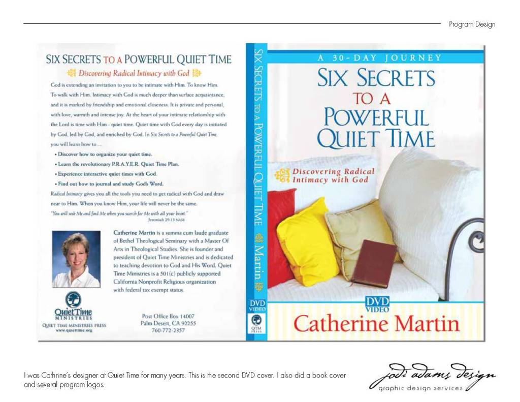 I am a strong Christian woman, wife, and mother. I believe doing the Lord’s work is a ministry and I was fortunate enough to work for a women’s ministry called “Quiet Time Ministry”. Also as a full-time staff graphic designer for Southwest Church in Indian Wells, California. At Quiet Time, I designed book covers, Bible study covers, and journal covers. I also designed a DVD cover. I was Catherine Martin’s designer until she got published by Harbor House. What an honor it was to work to promote such a Godly woman. At Southwest Church, it was my job to design all the digital media to promote sermon series, Bible studies, devotional groups, and discipleship groups. I also designed for children’s ministry. I would turn on the praise music, pray for the Lord to lead me, and go for it! If you have a small church, give me a holler. I will do your work for my nonprofit rate which is a nice discount because I’ve been blessed in so many ways. First, with God-given talent. I used my talent to freelance successfully from the time I became pregnant with our daughter in 1992 until my son graduated High School in 2016. And then some….I am rebuilding my freelance business now and hope to have some ministry projects. Here are my samples. God bless you and your dreams. I make dreams come true.